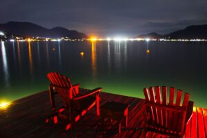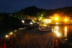 Por lá a propriedade também mantém um píer para atracação de embarcações, que é utilizada pelos hóspedes como deck de contemplação, já que diversas espreguiçadeiras estão espalhadas pelo corredor de cerca de 60 metros de comprimento. O lugar é perfeito para tomar banho de sol e se encantar com o visual incrível da enseada de Ilhabela. À noite a lua e as estrelas dão um show, devido à baixa luminosidade.