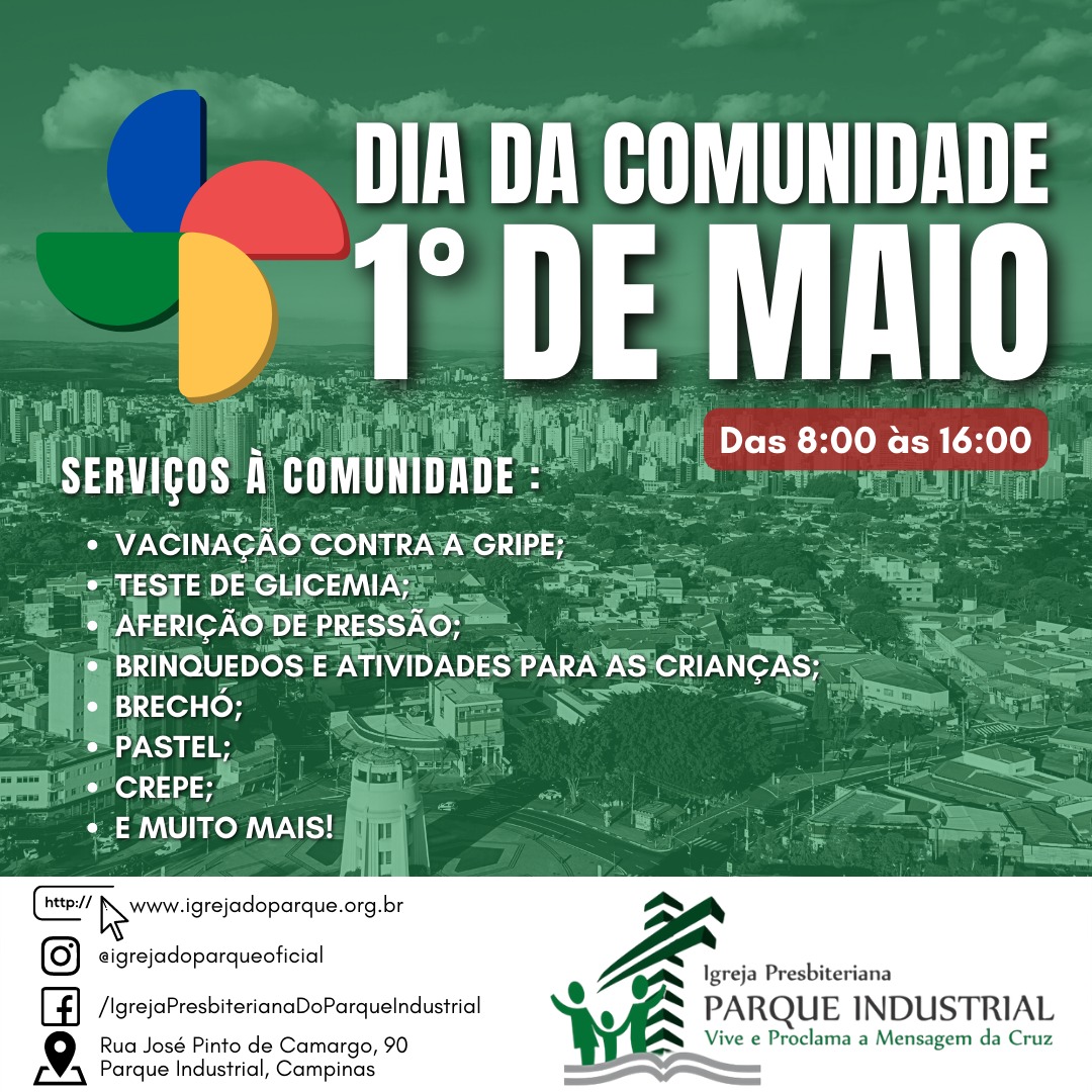 A Igreja Presbiteriana do Parque Industrial promove neste domingo (1º), Dia do Trabalhador, o tradicional Dia da Comunidade, evento que já acontece há mais uma década e está sendo retomado após dois anos de pandemia.