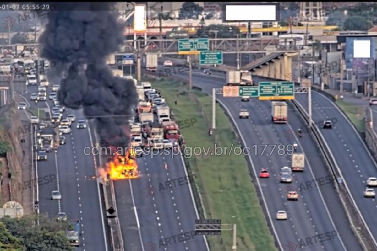 Um caminhão em chamas provocou interdição total na Rodovia Anhanguera (SP-330), sentido capital, no início da manhã desta quarta-feira (7), em Sumaré.