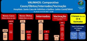A Prefeitura de Valinhos realizou comparativo da situação da pandemia no município. Os números confirmam que o avanço da imunização trouxe redução de casos graves e de internações em UTI por Covid-19 e SRAG (Síndrome Respiratória Aguda Grave), apesar do aumento vertiginoso de casos em razão da variante Ômicron. E confirmam a maior suscetibilidade das crianças à infecção pelo vírus. Em dezembro passado, havia quatro casos semanais envolvendo crianças, em média, taxa que subiu para 20 por dia em janeiro deste ano.