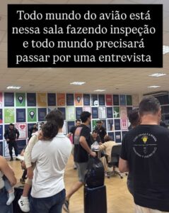 Ao descer do avião, todos foram levados para uma sala com cerca de 50 policiais armados. “Lá dentro, a Polícia Federal nos informou que havia suspeita de bomba e que todos passariam por entrevista. Nunca passei por isso na vida.”
