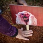 São imagens coletadas pela artista em seus deslocamentos diários que estão retratadas nas plaquinhas de madeira ‘plantadas’ em meio as flores e folhagens.