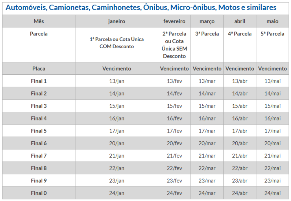 Assim como no ano passado, a fim de facilitar o pagamento do contribuinte que opta pelo parcelamento do tributo, a Sefaz-SP definiu todos os vencimentos no mesmo dia do mês – a placa 6, por exemplo, tem vencimento em 20 de janeiro, 20 de fevereiro, 20 de março, 20 de abril e 20 de maio. Caso o vencimento ocorra em finais de semana ou feriados, o pagamento poderá ser feito no próximo dia útil.