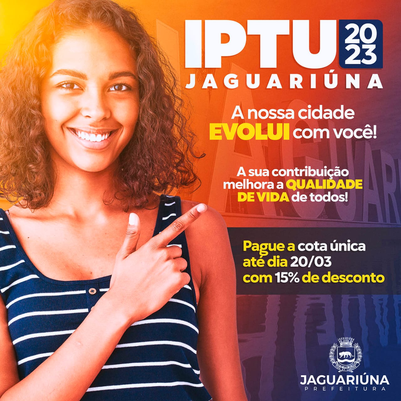 Os contribuintes de Jaguariúna têm até esta quinta-feira, dia 20 de abril, para pagar a cota única do Imposto Predial e Territorial Urbano (IPTU) com desconto de 15%. No mesmo dia também vencem a primeira e a segunda parcelas. O tributo poderá ser pago em cota única ou em 10 parcelas, sem desconto.