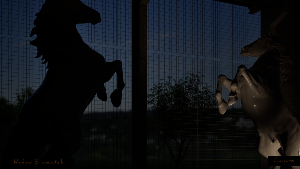 Segundo o artista, com imponentes 5,15m de altura, os dois cavalos juntos formam uma espécie de pórtico monumental para ser apreciado e fotografado pelos moradores e turistas. O artista se inspirou na raça mangalarga marchador para concepção das esculturas, deixando claro sua própria leitura estética do animal, transmitindo também sensação de movimento e elegância.