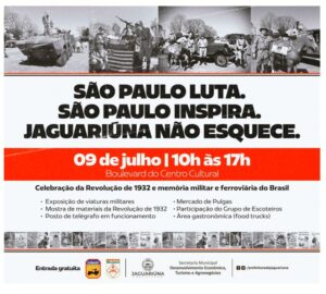 Nesta quarta-feira, feriado de 9 de julho, Jaguariúna se transformará em um grande palco de celebração histórica e cultural para reviver os últimos episódios da Revolução Constitucionalista de 1932. Aberto ao público e com entrada gratuita, o encontro no Centro Cultural da cidade reunirá veículos militares históricos, encenações temáticas, apresentação da Banda da EsPCEx, food trucks e atividades educativas.