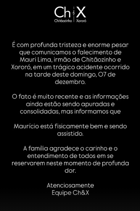 Na página oficial da dupla Chitãozinho & Xororó, há um comunicado sobre a morte.