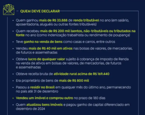 Quem recebeu até dois salários mínimos mensais durante 2024 está dispensado de fazer a declaração, salvo se se enquadrarem em outro critério de obrigatoriedade.