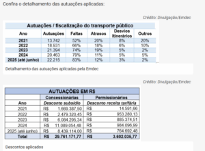 Essas autuações resultaram em mais de R$ 29,7 milhões em multas que foram descontados do subsídio repassado aos operadores do sistema convencional de transporte público nos últimos cinco anos, por situações que causaram prejuízos aos usuários: viagens não cumpridas, quebras, atrasos, etc.