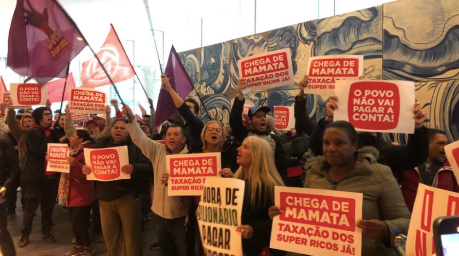 Os manifestantes também criticaram o Congresso Nacional, por barrar propostas como o novo IOF e manter isenções sobre lucros e dividendos. O protesto cobra a implementação de uma reforma tributária que taxe as grandes fortunas no Brasil.