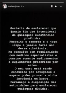 “Matheus Jesus contratou advogado particular para defendê-lo no caso, que teria ocorrido de maneira incidental quando ele fez um tratamento no Rio de Janeiro. A Ponte Preta irá aguardar o desenrolar do caso para se pronunciar, contudo, enquanto estiver vigente a suspensão, o contrato da Ponte com o jogador também fica suspenso”, informou a Ponte Preta, por meio de nota enviada pela assessoria de imprensa.