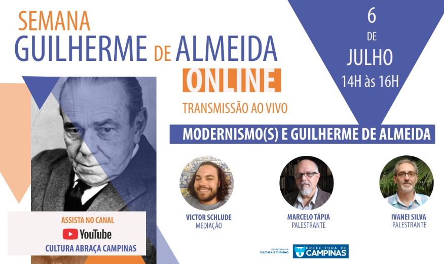 A Secretaria Municipal de Cultura, por meio da coordenadoria setorial de Bibliotecas e comissão organizadora, promove nesta terça-feira (6), das 14h às 16h, live sobre Modernismo (s) e Guilherme de Almeida. A transmissão virtual faz parte da programação da Semana Guilherme de Almeida, que começou no domingo, 4 de julho e vai até o dia 11 de julho, próximo domingo.