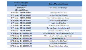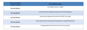 As instituições filantrópicas concorreram ainda a outros 50 prêmios de R$ 10 mil. Outras pessoas físicas e condomínios foram sorteados com 10 prêmios de R$ 100 mil, 15 de R$ 50 mil, 20 de R$ 10 mil, 50 de R$ 5 mil e 500 prêmios de R$ 1 mil.