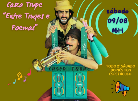 O Centro Cultural Casarão abre suas portas neste sábado (9) para o espetáculo “Entre Truques e Poemas” da Casca Trupe, formada pelos artistas Miguel Rosa e Rodrigo de Abreu, às 16h, com entrada gratuita. Apresentação faz parte da programação de apresentações da Mostra Casarão 20 anos.