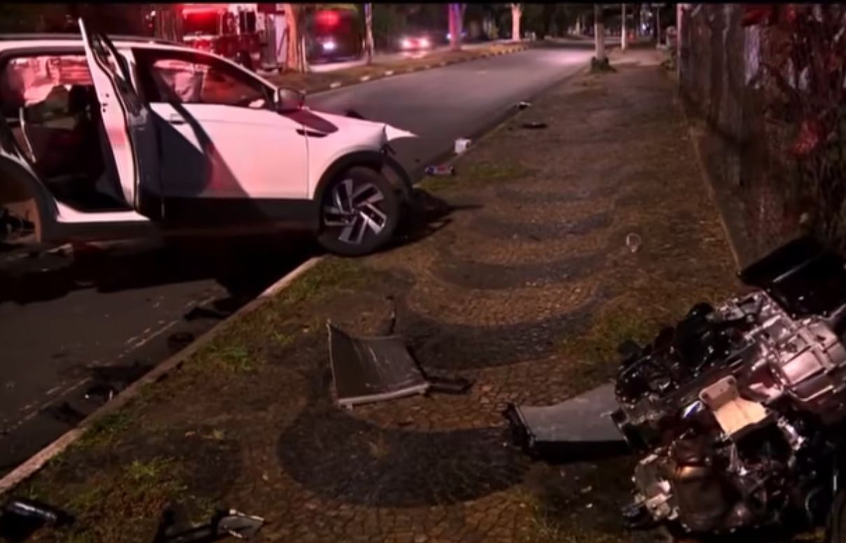 Testemunhas relataram que o motorista teria se distraído com o celular enquanto dirigia em direção a uma adega, o que provocou a perda de controle do veículo. O impacto da colisão fez com que o motor fossem arremessadas a alguns metros.