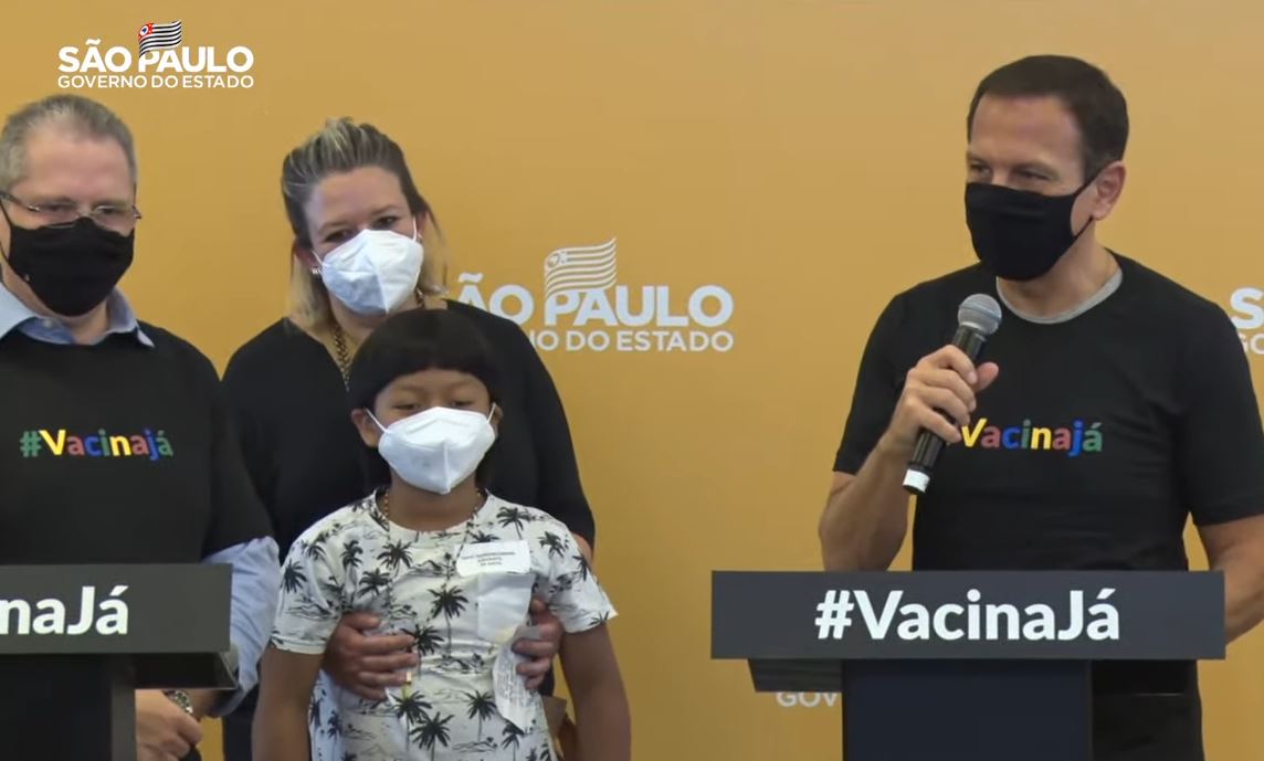 Davi Seremramiwe Xavante foi a primeira criança vacinada contra Covid no Brasil junto com o governador Doria e autoridades da área da Saúde. Foto: Reprodução