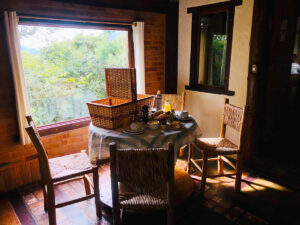 Entre as opções de cabanas estão a Mezanino com Hidro, a Pôr do Sol com Hidro e Sauna e a Floresta com Hidro. A Mezanino tem dois andares, mezanino com cama de casal queen size e banheira de hidromassagem.