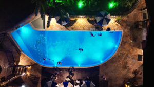 Em frente à piscina está localizado o Restaurante Coquille, com petiscos, lanches e drinks refrescantes que podem ser degustados durante um mergulho e outro.