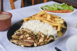 O cardápio do Restaurante Coquille é bem variado. Tem desde porções de fritas, mini coxinhas, bolinhas de queijo, iscas de carne e peixe e mini pastéis; a pratos mais elaborados, como a parmegiana de mignon e peito de frango, peixes da estação (com champignon, alcaparras, arroz branco e fritas) e contra filé acebolado, também com fritas e arroz branco. Todos os pratos vêm com acompanhamentos.
