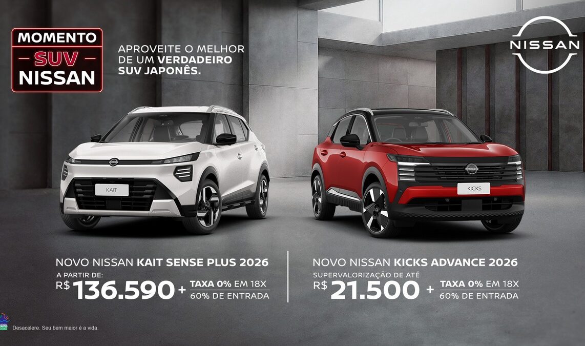 A campanha de vendas ‘Momento SUV Nissan’ traz o Nissan Kait e o novo Nissan Kicks com condições especiais, válidas até este sábado nas mais de 200 concessionárias da marca espalhadas pelo país.