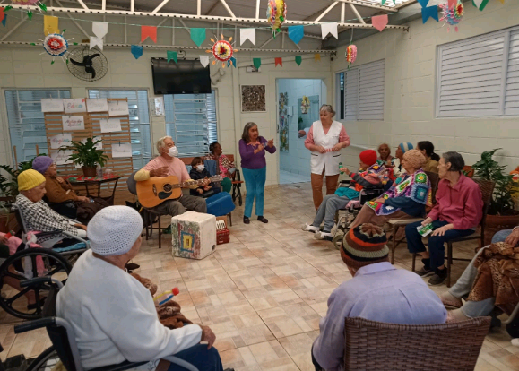 Parte das moradoras tem dificuldades de locomoção, até mesmo algumas são cadeirantes. Há também aquelas com doença de Alzheimer ou demência vascular, e esse trabalho com música e instrumentos musicais tem ajudado a fortalecer o convívio entre elas.