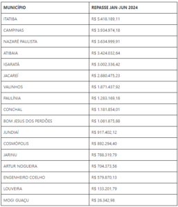 A Concessionária Rota das Bandeiras, empresa responsável pela administração do Corredor Dom Pedro de rodovias, repassou R$ 32,6 milhões em Imposto Sobre Serviços (ISS) no primeiro semestre deste ano para os 17 municípios que compõem a malha sob sua responsabilidade. O valor é 16% superior ao repassado no primeiro semestre de 2023. Itatiba foi a cidade com maior arrecadação, seguida por Campinas (ver quadro).