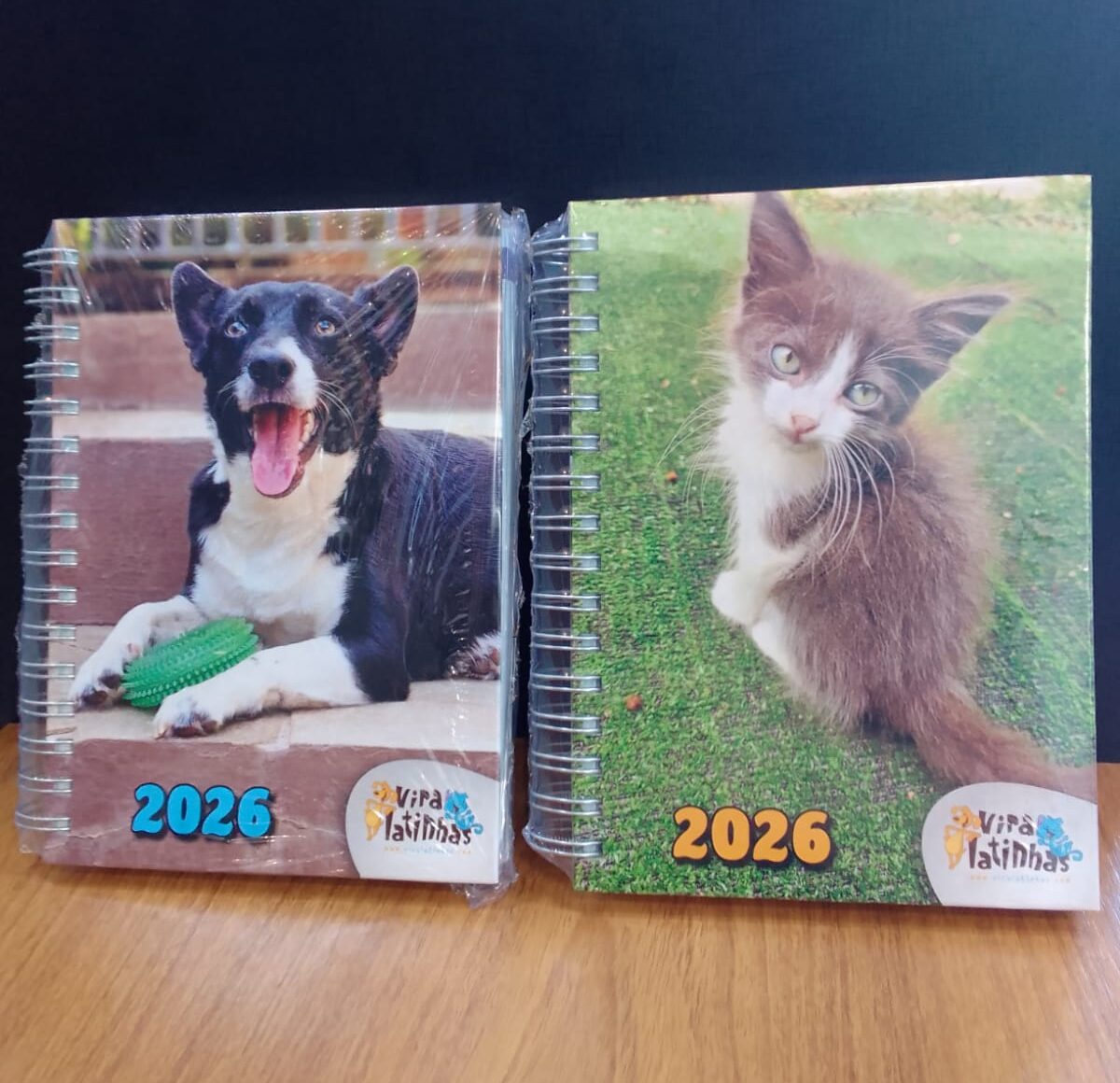 A agenda 2026 tem duas opções de capas: uma com a foto do cachorro Tobias, que vive em lar temporário enquanto aguarda ser adotado, e outra tem a imagem da gatinha Charmosinha, adotada recentemente.