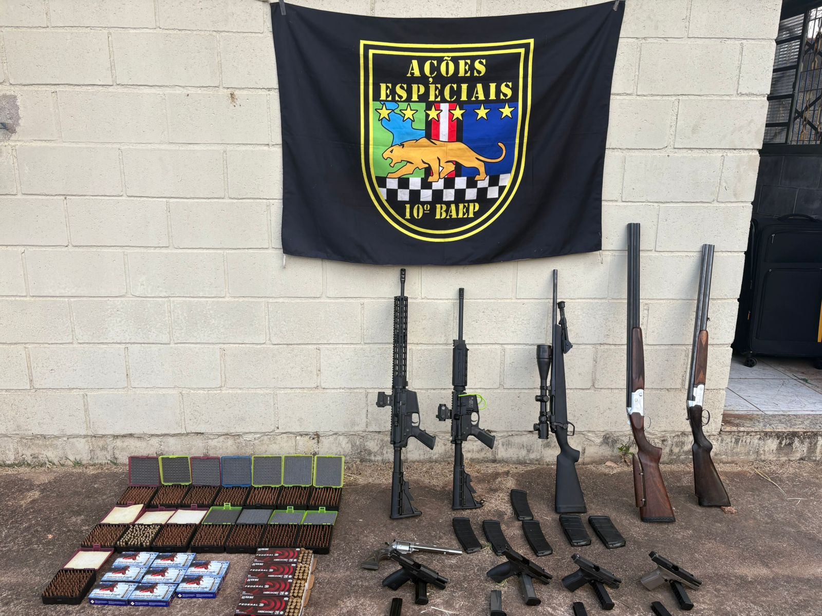 No local, as equipes encontraram um piso falso com dez armas, entre fuzis e pistolas, além de diversas munições. Todo o material foi apreendido e encaminhado à perícia.