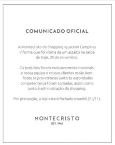 “O Iguatemi Campinas informa que registrou uma ocorrência na tarde desta quinta-feira, 20/11, em uma de suas operações. O empreendimento acionou imediatamente as autoridades competentes, que encerraram o caso. O shopping esclarece que todos os clientes e colaboradores estão bem e em segurança, e reforça que está contribuindo com as investigações.”