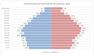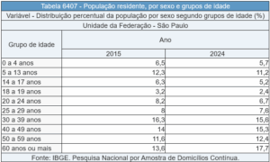 Já a população no estado com menos de 35 anos de idade representava 53% (23 milhões) do total em 2015, diminuindo para uma parcela de 46,4% (21,3 milhões) em 2024.