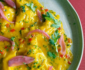 O prato é finalizado com o exclusivo molho de Iemanjá, desenvolvido pelo chef em uma interpretação autoral que combina toques picantes equilibrados por notas cítricas de laranja, resultando em um contraste aromático e sofisticado.