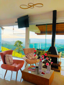 O que chama a atenção das acomodações é que a parte voltada para a montanha, de onde é possível avistar as cidades de Córrego do Bom Jesus, Cambuí e Estiva, é toda envidraçada, não há paredes de concreto ou qualquer tipo de material. São quase 10 metros quadrados de vidros. Uma verdadeira vitrine para a natureza.