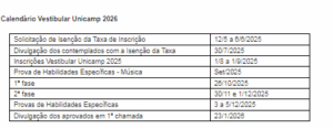 O calendário do Vestibular Unicamp 2026 já foi divulgado na página da Comvest e as inscrições serão realizadas do dia 1º de agosto a 1º de setembro de 2025, pela internet. Já as inscrições para a modalidade Enem-Unicamp serão realizadas em novembro.