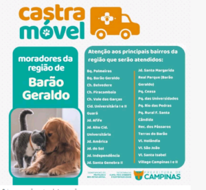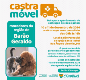 O Castramóvel da Prefeitura de Campinas vai passar pela região de Barão Geraldo para castração gratuita de 800 cães e gatos. Os interessados devem se inscrever entre terça-feira e quarta, dias 10 e 11 de dezembro, das 9h às 16h, no Salão Paroquial da Igreja Santa Izabel, na rua Ângelo Vicentin, 601.