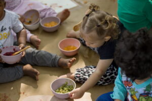 As tintas comestíveis utilizadas nos ateliês são produzidas pelas educadoras a partir de pigmentos vegetais como suco da beterraba, cenoura, couve, espinafre e até açafrão da terra e levam em sua composição também bases como amido de milho, polvilho e sagu para maior diversidade de texturas e experimentação para a criançada.