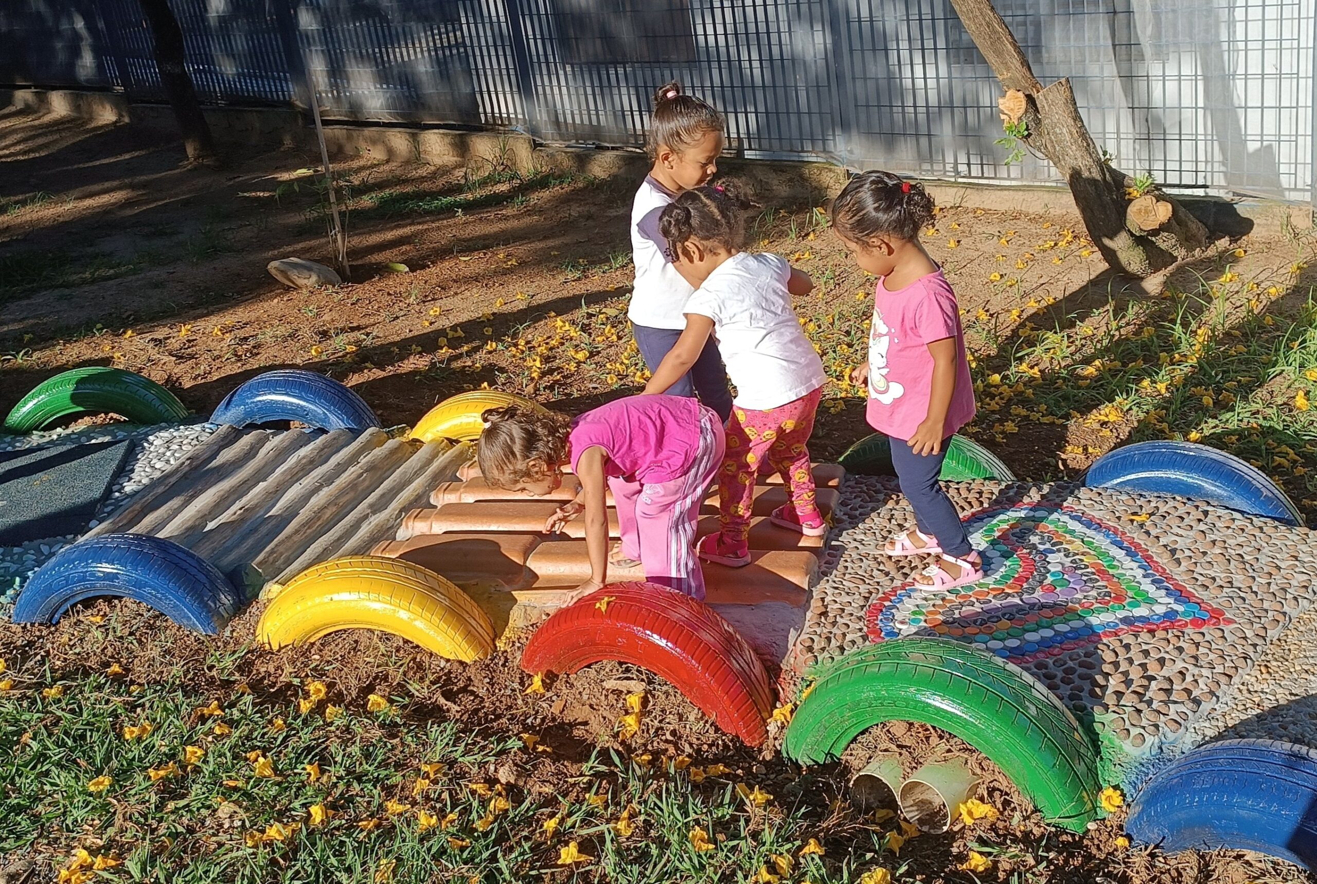 A escola tem ainda plantas ornamentais e a iniciativa mais recente foi a criação de um “espaço zen” em 2025. Ele reúne caminho sensorial, redário, slackline, som instalado e aspersores de água. “Ele nasceu da ideia das professoras que vislumbravam um local acolhedor e rico em explorações e sensações para as crianças”, contou Lorena.