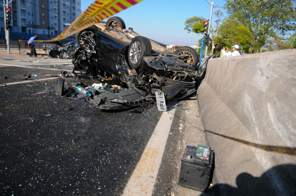 Um dos veículos atingidos capotou com o forte impacto. Foto: Barba Azul/Divulgação