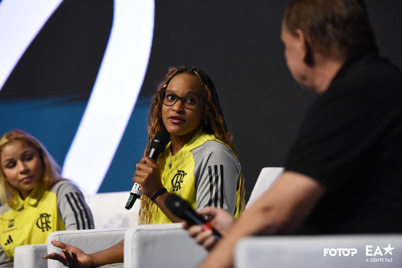Rebeca Andrade foi a atração nesta sexta-feira (14) do CBC & Clubes Expo, evento promovido pelo Comitê Brasileiro de Clubes (CBC), em Campinas. A medalhista de ouro no solo nos Jogos de Paris esteve acompanhada das colegas de Flamengo e também medalhistas olímpicas Flávia Saraiva e Lorrane Oliveira. O evento teve início na terça-feira (11) e o encerramento é neste sábado (15), com as presenças de Jade Barbosa, Magic Paula e Maurren Maggi.
