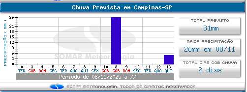 A região de Campinas segue em estado de atenção, com previsão de novas pancadas de chuva ao longo do dia, acompanhadas de raios, rajadas de vento que podem ultrapassar os 80 km/h e possibilidade de granizo isolado.