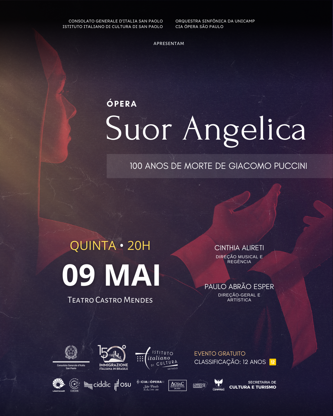 No dia 09 de maio, próxima quinta-feira, às 20h, o Teatro Municipal Castro Mendes recebe a Orquestra Sinfônica da Unicamp (OSU) e a CIA Ópera São Paulo para uma homenagem aos 100 anos de morte de Giacomo Puccini com a Ópera Suor Angélica.
