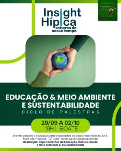 A Sociedade Hípica de Campinas realiza, entre os dias 29 de setembro e 2 de outubro, o terceiro ciclo de palestras do “Insight Hípica – Saberes do Nosso Tempo”, projeto que busca integrar diferentes áreas do conhecimento em palestras temáticas exclusivas para os associados do clube.