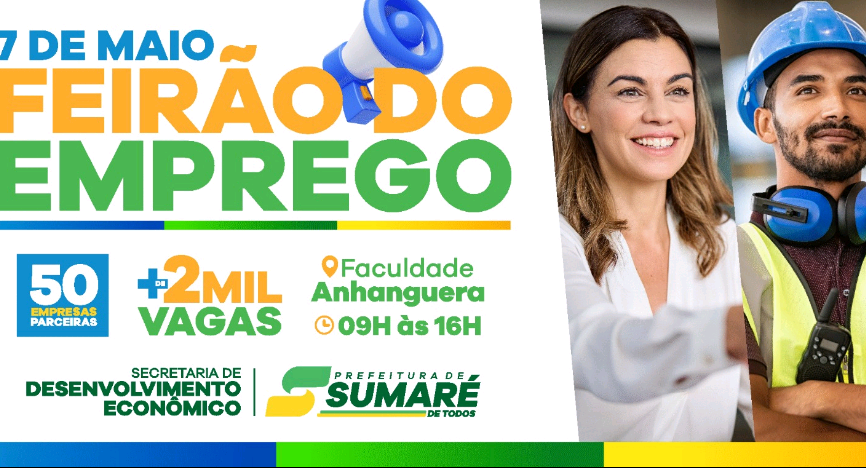 Sumaré vai receber nesta quarta-feira (7) o Feirão de Emprego com mais de 2.040 vagas em diversas áreas. O evento será das 9h às 16h na Faculdade Anhanguera, localizada na Av. Eugênia Biancalana Duarte, 501, Jardim Primavera.
