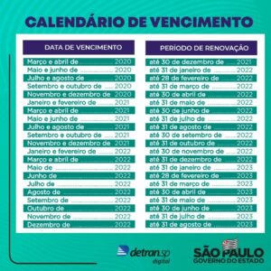 A nova legislação definiu um cronograma completo (veja abaixo) para CNHs que tiveram vencimento entre 1º. de março de 2020 e 31 de dezembro de 2022. O período para a regularização é feito com base no mês de vencimento do documento. Por exemplo, CNHs vencidas entre maio e junho de 2020 deverão ser renovadas até 31 de janeiro de 2022.