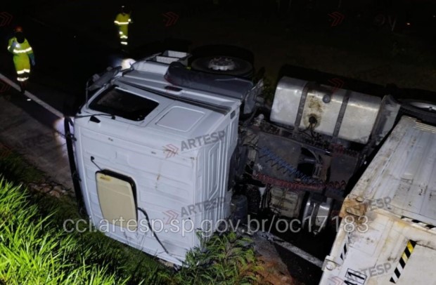 A ocorrência aconteceu às 22h55, de acordo com registro no sistema da concessionária Autoban. Ao tentar acessar a alça, o veículo colidiu com uma canaleta e tombou. O motorista não se feriu. O guindaste foi acionado para realizar o destombamento e a ação seguiu pela madrugada.