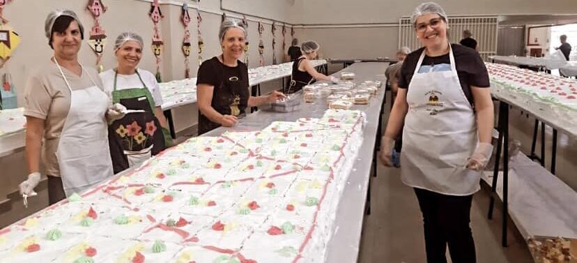 A parte da montagem realizada no salão da igreja é também grandiosa. Os 25 anos da tradição serão comemorados sobre dez mesas de bolo recheado com doce de leite e coberto com chantilly. Cada mesa tem 15 metros de comprimento e a conta é de 18,4 mil pedaços no total.