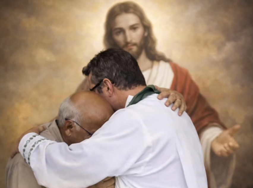 Sem nada perguntar ou interpelar, sem nenhuma palavra, o sacerdote apenas o acolhe, sem julgamentos.