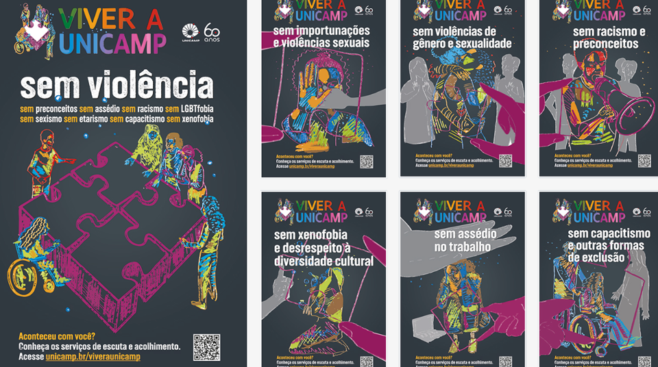 Foram criados sete diferentes cartazes, cada um trazendo um aspecto da campanha. Um deles, por exemplo, promove o lema principal “Viver a Unicamp” e algum subtema, como por exemplo: “Sem violência de gêneros e sexualidade” e “Sem importunações e violências sexuais”. Os s cartazes, cujos desenhos foram feitos pela artista plástica Rafaela Repasch, mestranda no Instituto de Artes (IA), ficarão disponíveis para download. Cartazes físicos também serão distribuídos nos campi.
