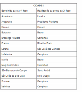 A Comvest ressalta que os candidatos devem ficar atentos aos locais das provas, já que eles não serão necessariamente os mesmos onde realizaram a primeira fase. Além dos locais, também há mudança de cidade nos casos indicados na tabela abaixo: