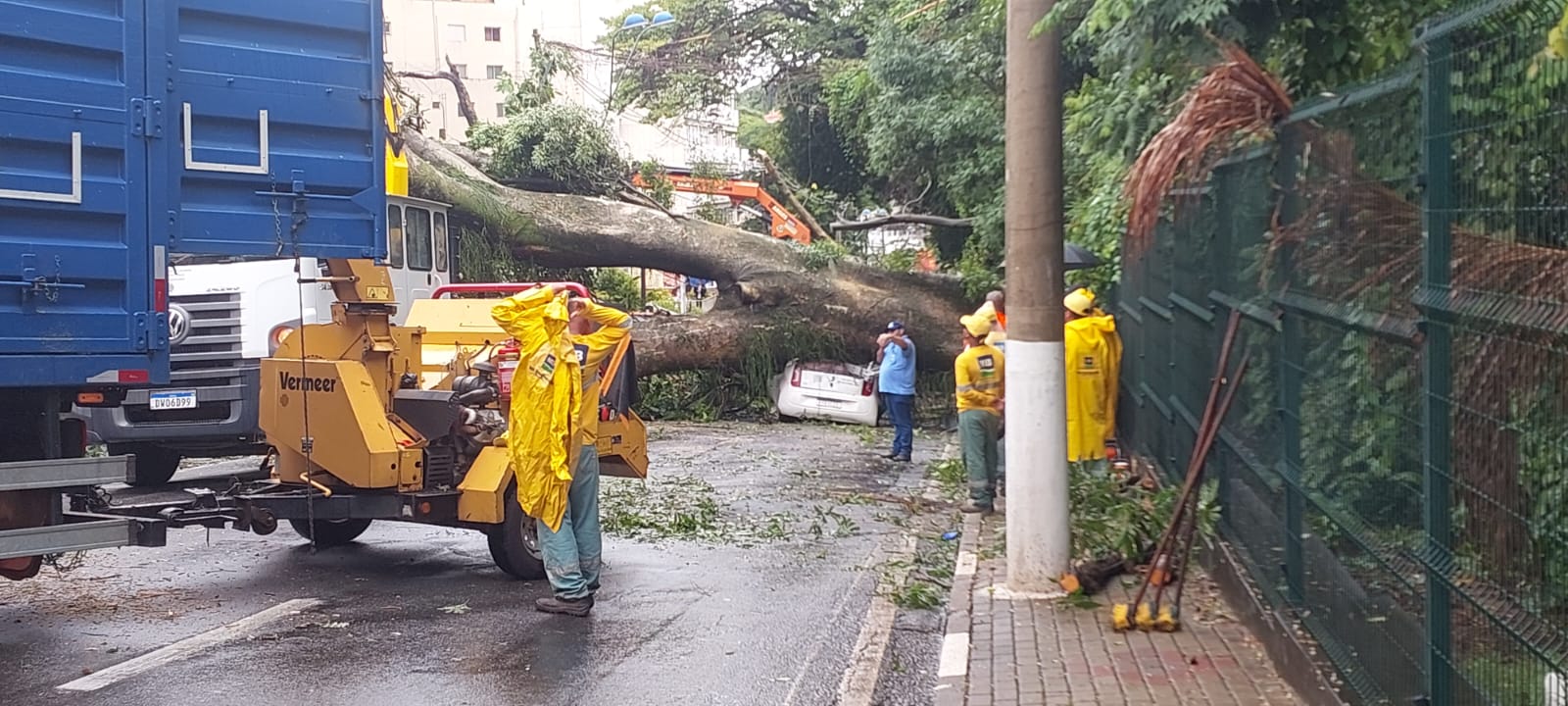 A árvore atingiu ainda duas casas do outro lado da Rua General Marcondes Salgado. A via dá acesso ao Laurão. Uma idosa de 90 anos foi retirada sem ferimentos do imóvel.