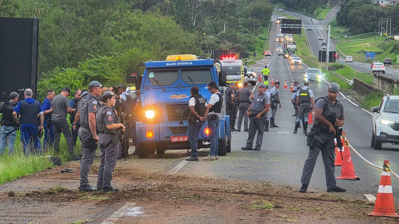 Uma tentativa de assalto a um carro-forte mobilizou diversas forças de segurança e provocou a interdição total da Rodovia Luiz de Queiroz (SP-304), em Piracicaba, no fim da tarde desta sexta-feira (2). A ocorrência foi registrada no km 144 da via e, segundo a Polícia Militar, envolveu entre 10 e 15 suspeitos armados, que utilizavam ao menos quatro veículos. Até o momento, não há registro de feridos e nenhum valor foi levado durante a ação.